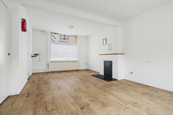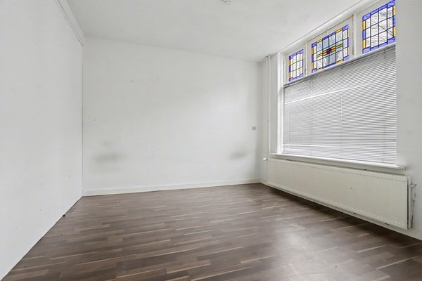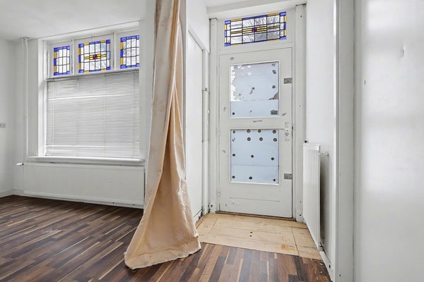 De woonkamer beschikt over een trapkast en een portaal. Vanuit dit portaal zijn nog een slaapkamer/ thuiswerkplek, de woonkeuken en de trapopgang naar de eerste verdieping bereikbaar. In de woonkamer zijn de karakteristieke glas-in-loodramen behouden gebleven.
