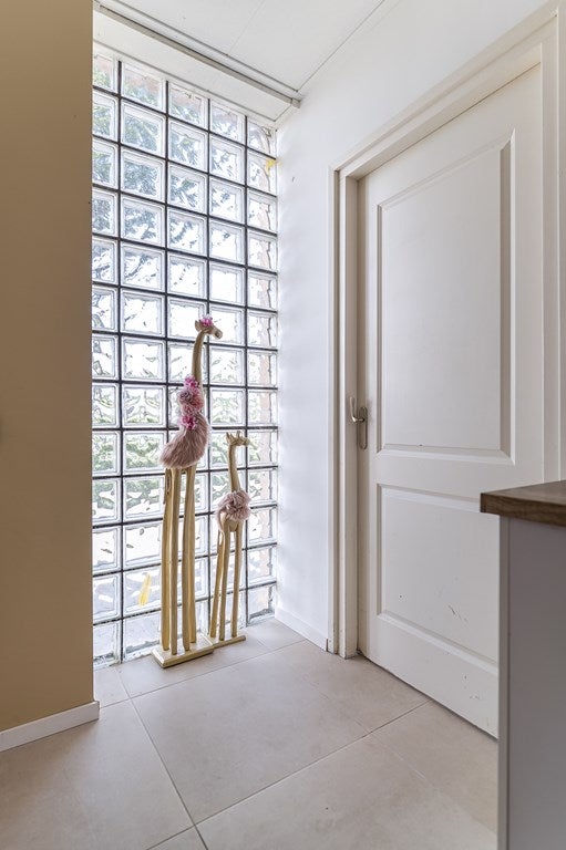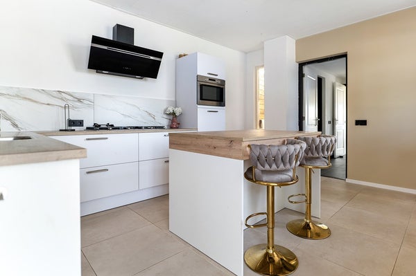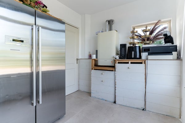 Via de hal bereikt u het vernieuwde toilet (2023), de woonkeuken en woonkamer. De moderne keuken is recent vernieuwd en voorzien van diverse inbouwapparatuur. Aansluitend bevindt zich een praktische bijkeuken met witgoedaansluitingen en cv-installatie (2002), welke vervangen dient te worden.