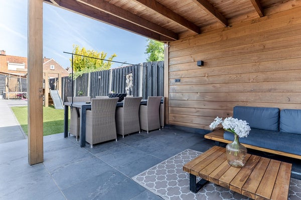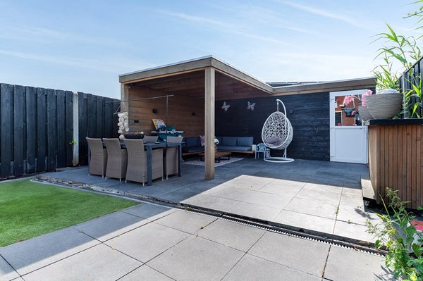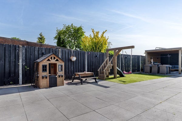 De onderhoudsvriendelijke achtertuin is zonnig gelegen en voorzien van een overkapping en brede achterom. Het geïsoleerde bijgebouw (met 12 zonnepanelen) is multifunctioneel inzetbaar, bijvoorbeeld als werk- of hobbyruimte.