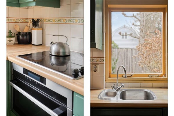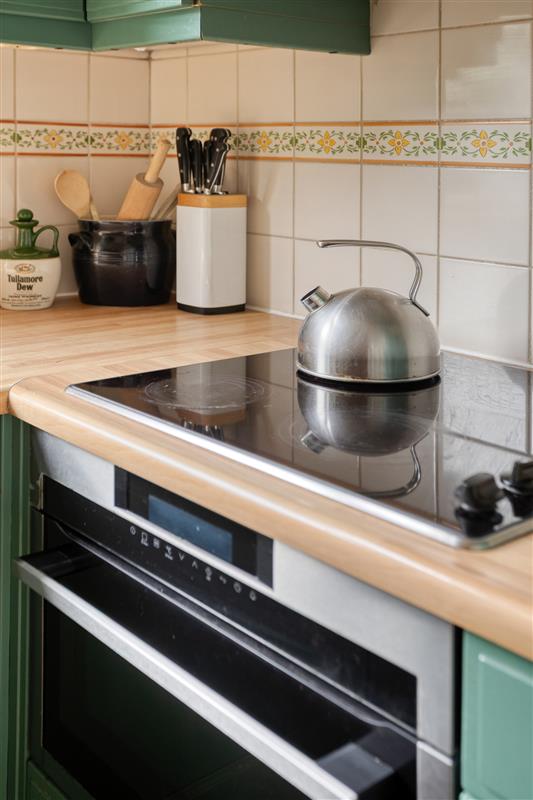 De half-open keuken is uitgerust met een vaatwasser, koel-vriescombinatie, keramische kookplaat en afzuigkap.