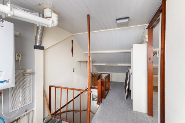 Via een vaste trap bereik je de zolderverdieping met overloop en opstelplaats voor de centrale verwarmingsketel. Hier bevindt zich de vierde ruime slaapkamer. Dankzij de dakkapel over de volledige breedte van de woning is deze kamer opvallend licht en ruim — ideaal als werkruimte of tienerkamer.