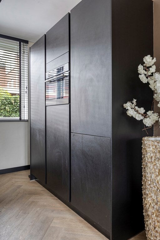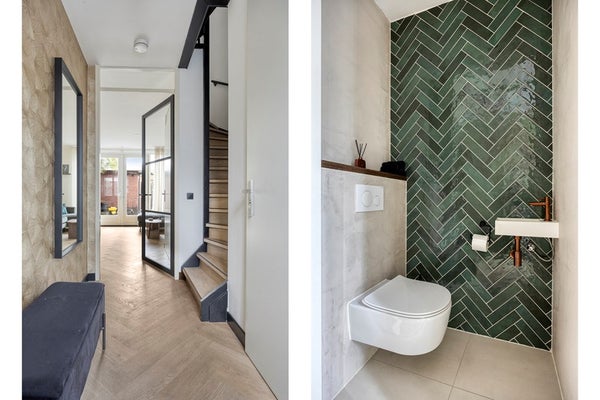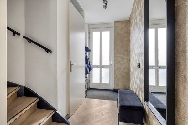 De hele begane grond is voorzien van een fraaie visgraatvloer en gestuukte wanden.