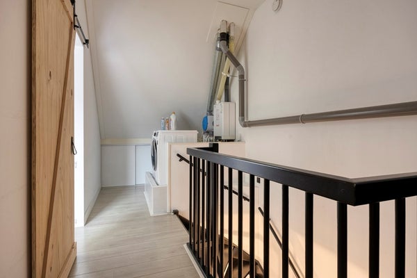 Overloop met CV-opstelling en wasmachineopstelling, slaapkamer.