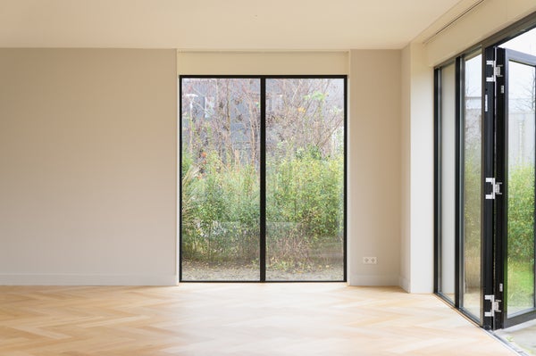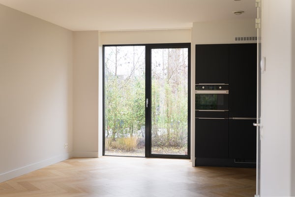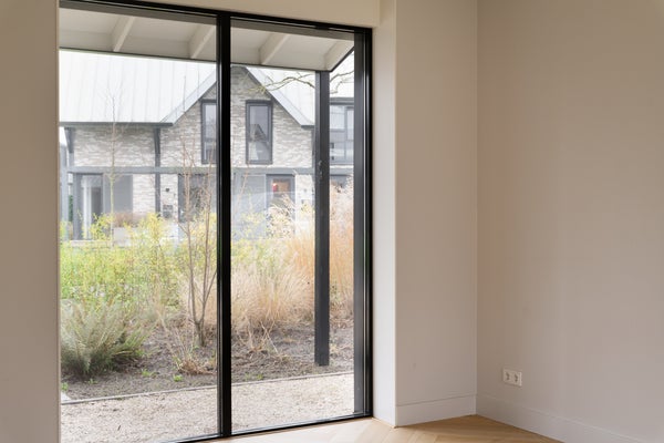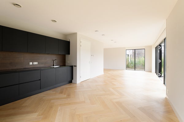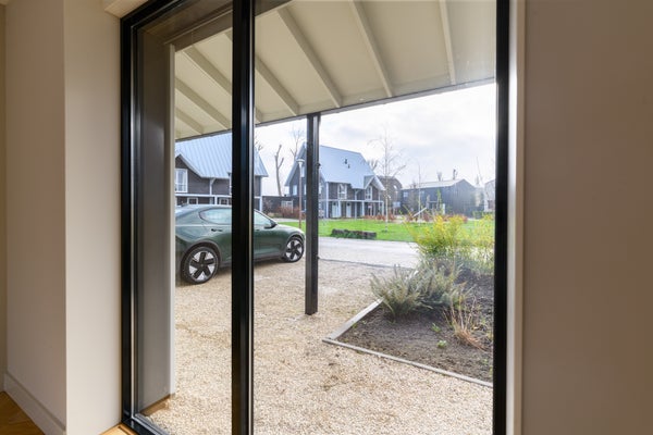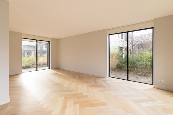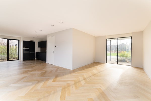 Via de entree betreed je de woning en valt direct de ruimtelijke opzet en verzorgde afwerking op. De hal biedt toegang tot het toilet, de trapopgang en de woonkamer. De woonkamer is gesitueerd aan de achterzijde van de woning en profiteert van veel lichtinval dankzij de grote openslaande deuren. Deze zorgen niet alleen voor een fijne verbinding met de tuin, maar bieden ook een vrij uitzicht op het omliggende groen. De visgraat eikenhouten vloer met vloerverwarming geeft de ruimte een warme en luxe uitstraling. In iedere ruimte is een eigen thermostaat aanwezig, wat zorgt voor optimaal wooncomfort.