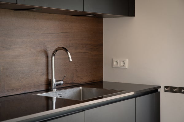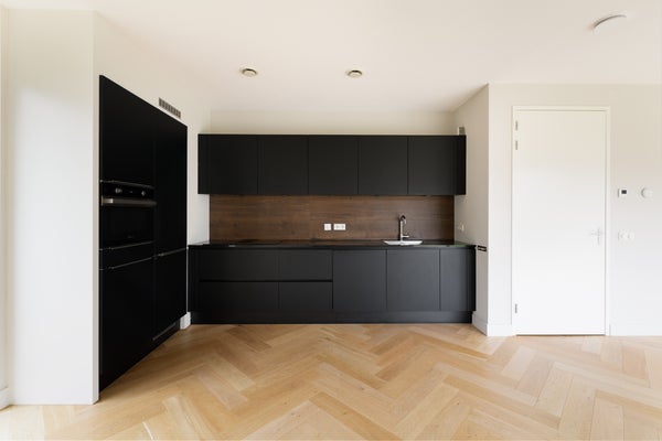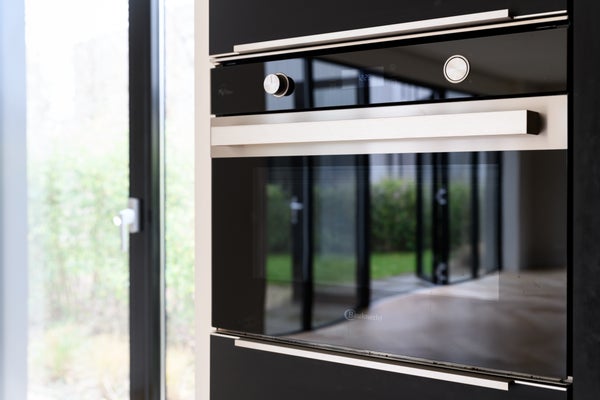 Aan de voorzijde van de woning bevindt zich de stijlvolle, moderne keuken. Deze is voorzien van hoogwaardige inbouwapparatuur en heeft een rustige, eigentijdse uitstraling. Vanuit de keuken heb toegang tot de achtertuin, waardoor binnen en buiten op natuurlijke wijze met elkaar worden verbonden.