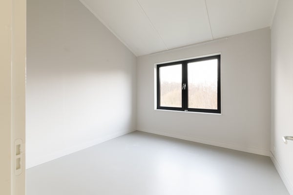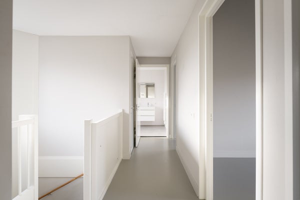 Op de eerste verdieping zijn vier ruime slaapkamers gerealiseerd. Alle slaapkamers zijn afgewerkt met een lichte gietvloer en voorzien van vloerverwarming en een eigen thermostaat. De luxe badkamer is modern uitgevoerd en beschikt over een inloopdouche, ligbad en een dubbel wastafelmeubel. Daarnaast is er een separaat toilet bereikbaar vanaf de overloop. Een praktische berging herbergt de warmtepomp, WTW-installatie en de aansluiting voor de wasmachine.