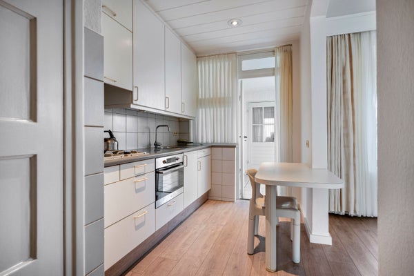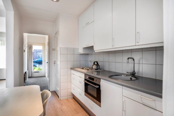 Dit woonhuis met aanbouw en een diepe tuin biedt een brede woonkamer van 4 meter met een open keuken en serre. Gelegen op een perceel van 201 m2, is het gebouwd in 1953. De indeling omvat een souterrain met provisiekelder. Op de begane grond vind je een hal met vernieuwde meterkast, toilet, en een doorzon woonkamer met een mooie laminaatvloer en toegang tot de serre. De open keuken is uitgerust met een moderne gaskookplaat en combi-oven. De zonnige achtertuin bevat een prachtige Japanse tuin met een vijver. Op de eerste verdieping zijn vier slaapkamers, waarvan één met airco, en een eenvoudige badkamer met douche. Een vlizotrap leidt naar de bergzolder op de tweede verdieping, waar de CV-ketel zich bevindt. Het huis heeft centrale verwarming, een slimme meter, en goede houten kozijnen met dubbele beglazing.