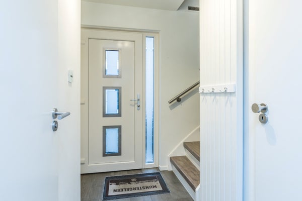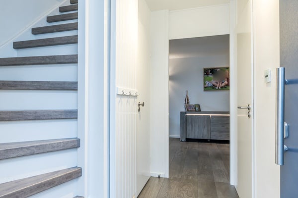 Via de oprit bereik je de overdekte entree. In de hal treft je een modern toilet en de meterkast. Zodra je de leefruimte betreedt, ervaart je direct de ruimte en luxe. De begane grond is uitgevoerd met een stijlvolle keramische tegelvloer in houtlook, uiteraard voorzien van vloerverwarming. De woning is volledig uitgerust met domotica: van verlichting en elektrische rolluiken tot wandcontactdozen, alarm en rookmelders – alles slim en comfortabel geregeld.