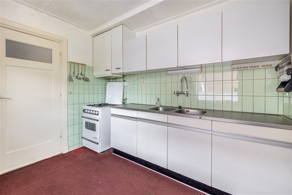 Keuken, 7.6 m² v.v. dubbele spoelbak, 4-pits gasfornuis en oven en vaste trap naar de kelder.