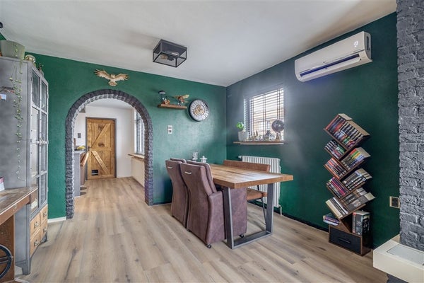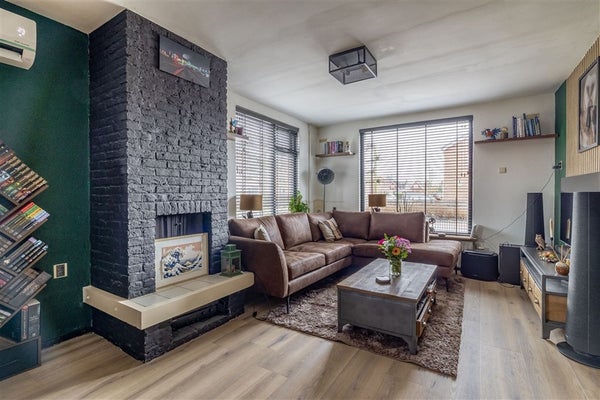 De sfeervolle woonkamer (ca. 25 m²) is voorzien van een nette laminaatvloer, airconditioning en een karakteristieke schouw, wat zorgt voor een warme en huiselijke uitstraling. De woonkamer staat in open verbinding met de keuken, wat zorgt voor een prettig en ruimtelijk geheel.