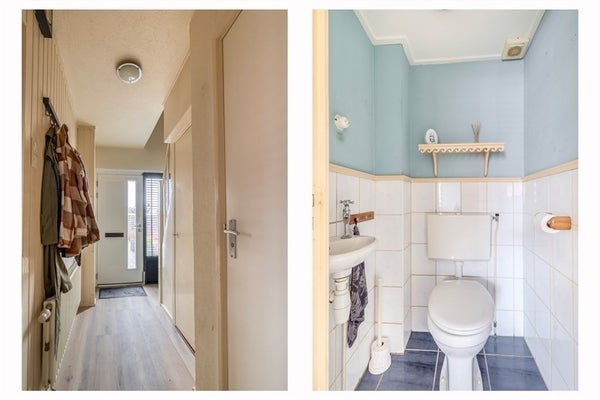 Via de entree komt u in de hal met laminaatvloer, meterkast en trapopgang. Vanuit hier bereikt u het toilet met fonteintje en de moderne badkamer (2024), uitgevoerd met vloerverwarming, een ruime inloopdouche, dubbele wastafel en designradiator.