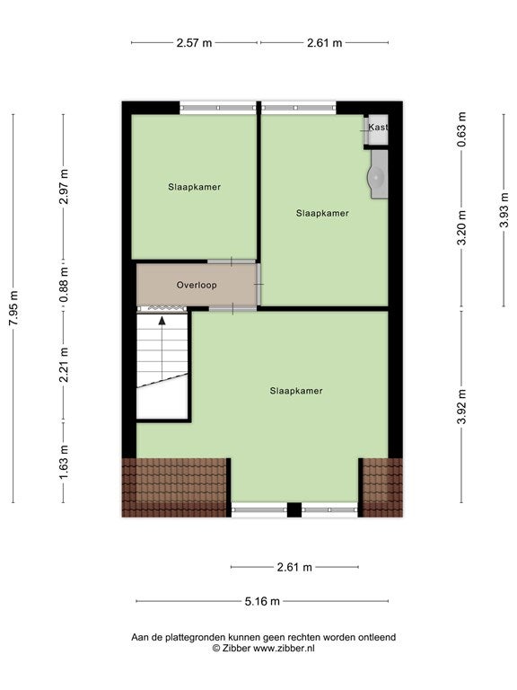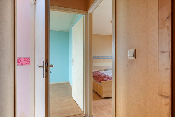De overloop geeft toegang tot 3 slaapkamers. De grootste slaapkamer ligt aan de voorzijde van de woning en is voorzien van een dakkapel. De andere 2 slaapkamers liggen aan de achterzijde. 1 van de slaapkamers is voorzien van een vaste kast en een wastafelmeubel.