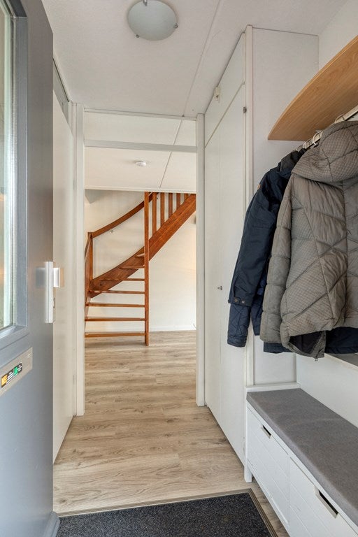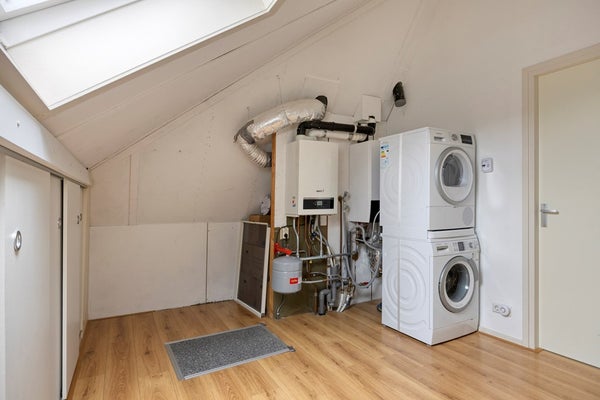 De voorzolder is voorzien van een dakraam voor voldoende lichtinval. Hier vindt u de opstelplaats voor de HR combikel (Nefit 2017), hybride warmtepomp (Daikin 2022), slimme mechanische ventilatie-unit en aansluiting voor wasmachine en droger. Achter schuifdeuren is veel bergruimte gecreëerd achter de knieschotten.