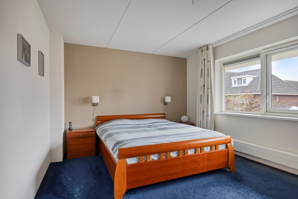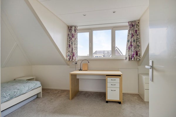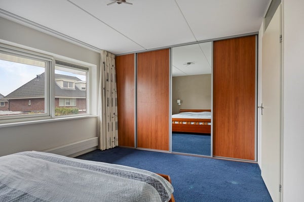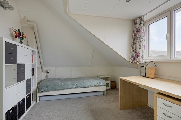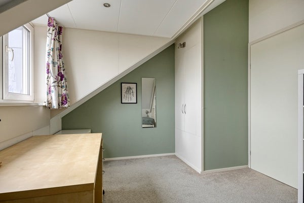 Door het plaatsen van de dakkapel aan de achterzijde van de woning is hier een fijne slaapkamer gerealiseerd met een vaste kast. De dakkapel is voorzien van elektrische screens.