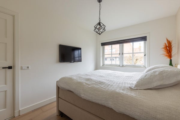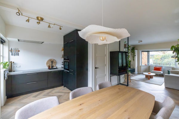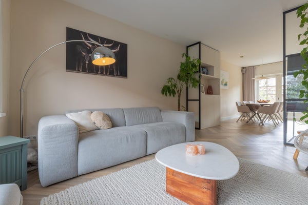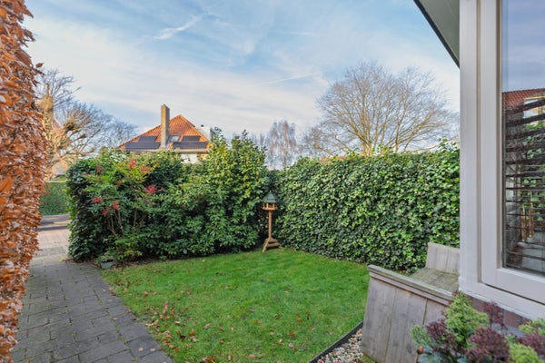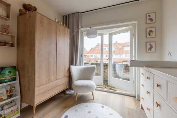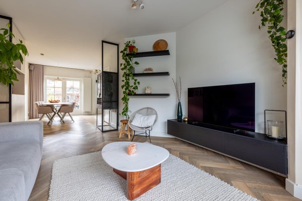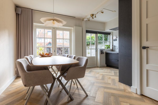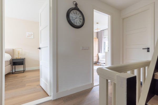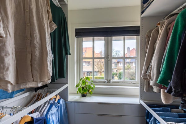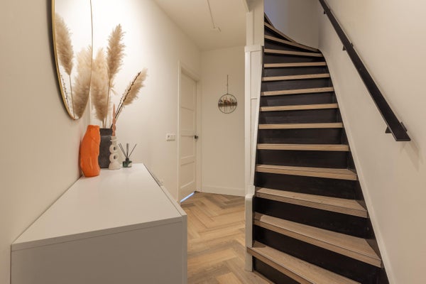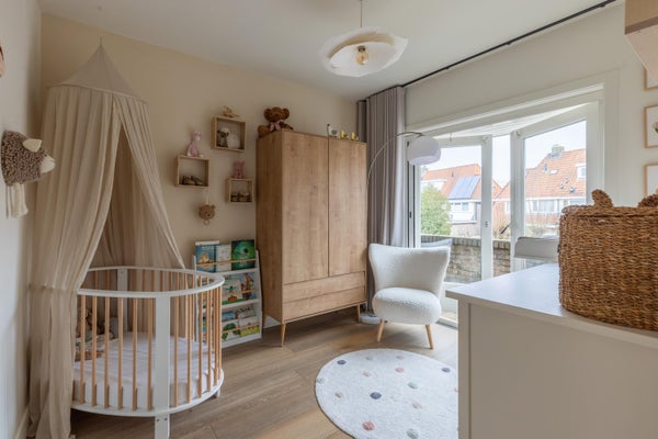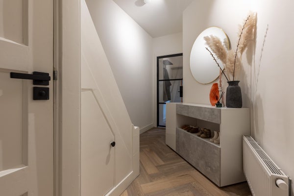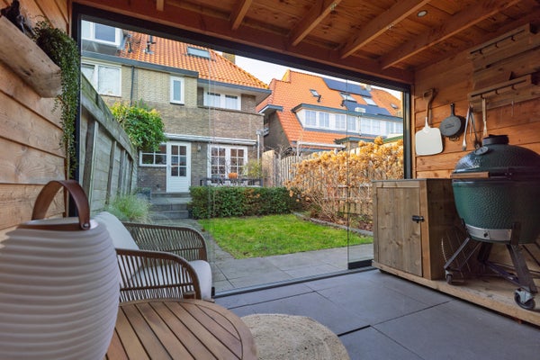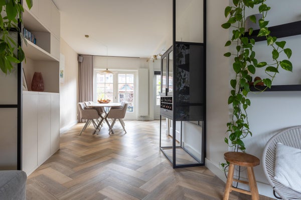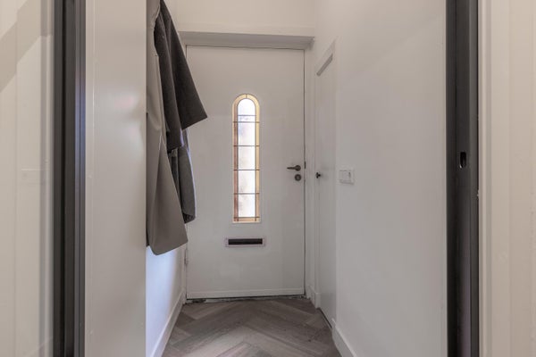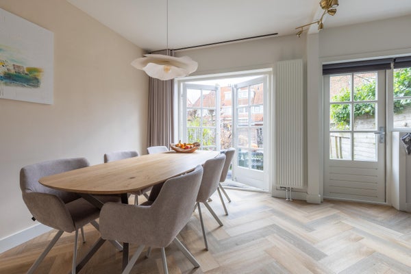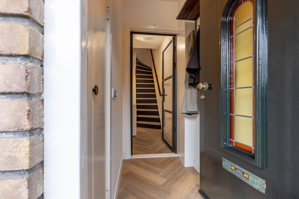 Deze karakteristieke eengezinswoning aan de rustige Generaal Kraijenhoffstraat in Naarden straalt charme uit. De woning heeft een ronde voordeur met glas-in-lood, een erker en een ruime voortuin, wat bijdraagt aan een warm straatbeeld. De sfeervolle binnenkomst leidt naar een elegante woonkamer met een open verbinding naar de eetkamer. De moderne zwarte keuken is uitgerust met diverse apparatuur en biedt toegang tot de zonnige achtertuin van circa 12,50 meter diep, met een overkapping en buitenkeuken. Op de eerste verdieping zijn twee ruime slaapkamers, een balkon en een derde kamer als inloopkast. De zolder heeft een royale slaapkamer en een compacte badkamer. Dit huis beschikt over vier slaapkamers, twee badkamers en ligt op loopafstand van voorzieningen en scholen, met goede verbindingen naar de A1 en station Naarden-Bussum.