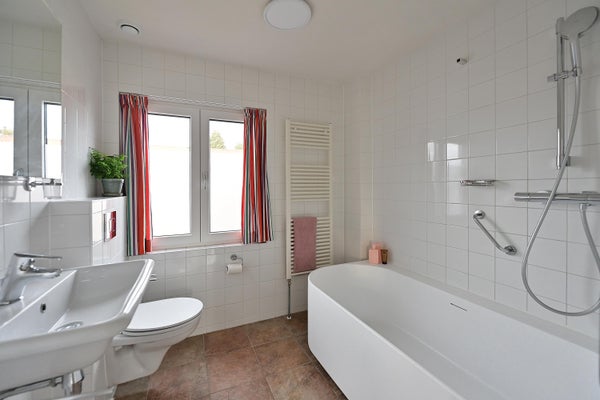 1e VERDIEPING: Overloop, twee ruime slaapkamers (voor en achter), een derde kleinere slaapkamer en een moderne badkamer met design bad, vloerverwarming, tweede toilet, wastafelmeubel en handdoekradiator.