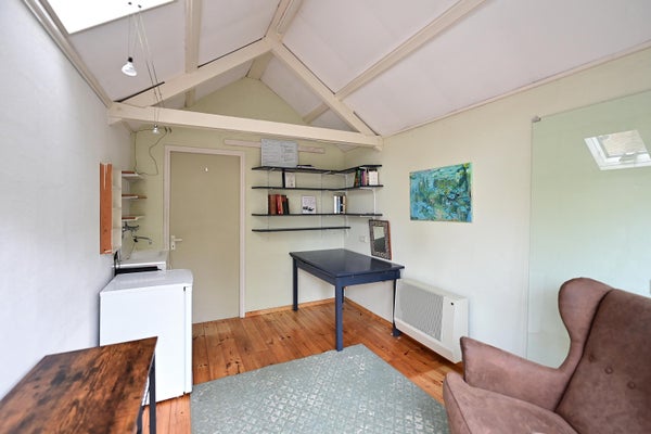 De vrijstaande, volledig geïsoleerde garage is omgebouwd tot een atelier van ca. 10 m², voorzien van een keukenblokje, dakramen, schuifpui en gaskachel. Een fijne ruimte voor werken aan huis, muziek maken of andere creatieve bezigheden. Achterin de tuin bevindt zich bovendien een overkapping met ruimte voor fietsen en extra opslag.