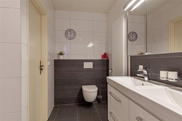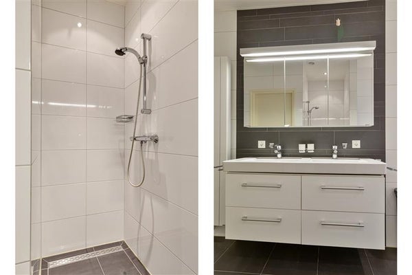 De badkamer is modern en praktisch ingericht, compleet met een ligbad, een royale inloopdouche, een dubbele wastafel, toilet en vloerverwarming. Het zorgt voor extra comfort.