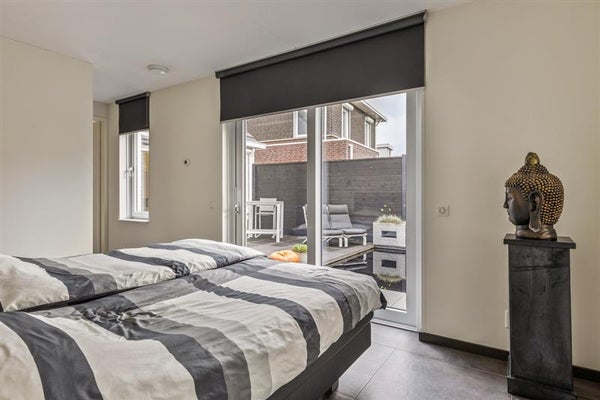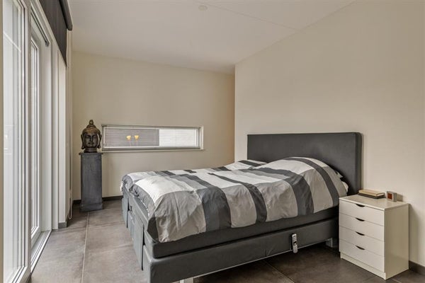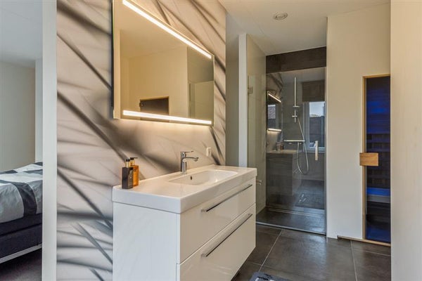 Leven op één niveau is de toekomst, en deze woning is daar helemaal klaar voor. De royale slaapkamer op de begane grond biedt een oase van rust en comfort. De aangrenzende badkamer, met zijn moderne inloopdouche, sauna en stijlvol wastafelmeubel, is een plek waar je heerlijk kunt ontspannen na een lange dag.
