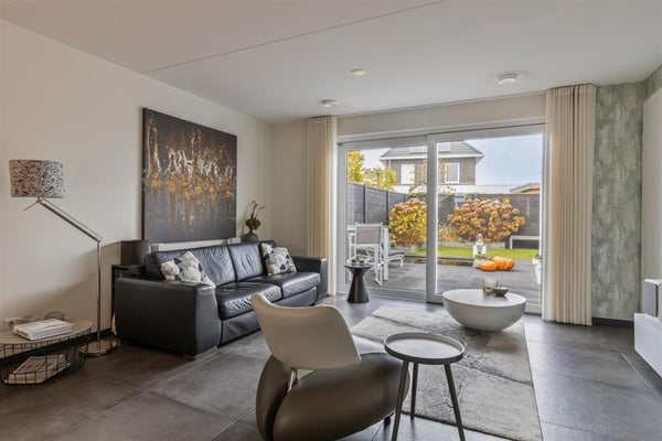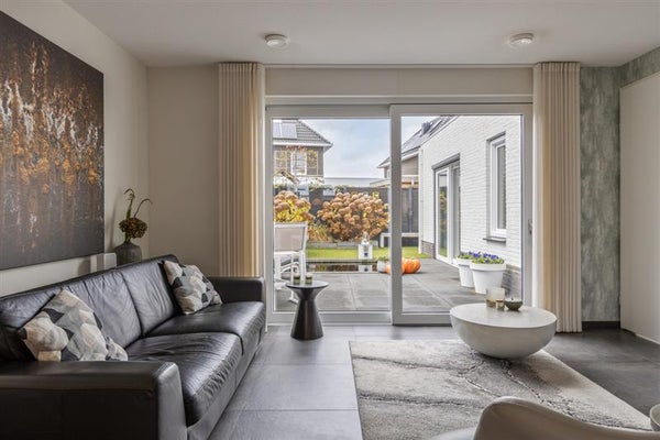 Fijne woonkamer met schuifpui: Geniet van een lichte, open ruimte met direct tuincontact dankzij de schuifpui die een prachtige verbinding vormt tussen binnen en buiten.