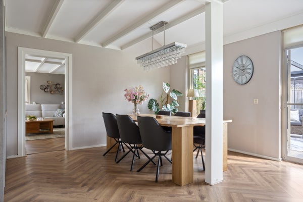 - De vrijstaande woning heeft een woonoppervlakte van 150 m² en beschikt over 5 kamers, waarvan 3 slaapkamers;
