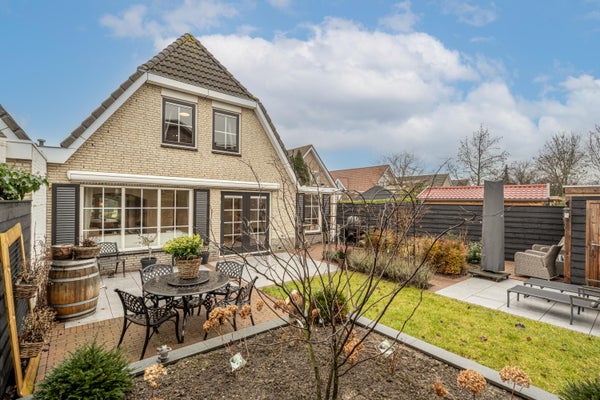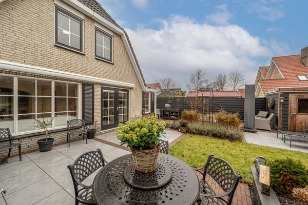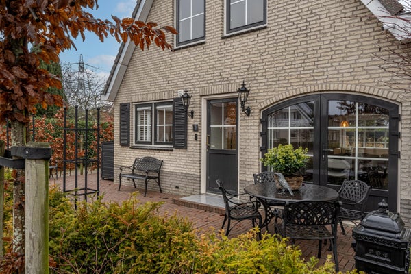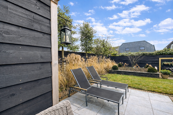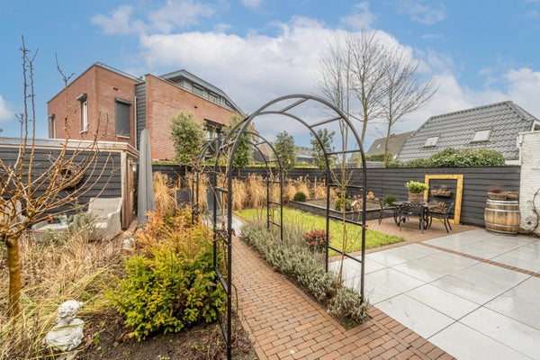 De tuin is verzorgd aangelegd met een combinatie van gazon, terrassen en borders, waardoor er meerdere fijne plekken zijn om te zitten. Een sierlijke boog met rozen versterkt de landelijke uitstraling. Daarnaast zijn er een water- en stroomaansluiting aanwezig.