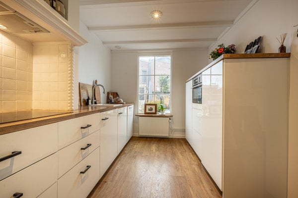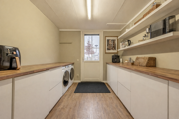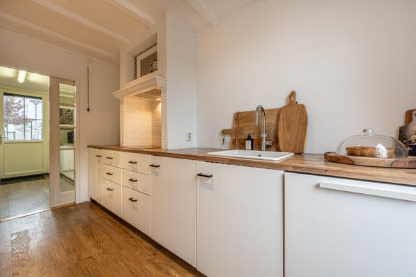 De keuken is uitgevoerd met witte keukenfronten en een houten werkblad en biedt veel bergruimte. De keuken is voorzien van een AEG inductiekookplaat, Quooker, vaatwasser, combioven en magnetron. Aansluitend bevindt zich de bijkeuken met ruimte voor de wasmachine, droger en extra opslag.