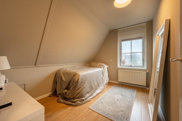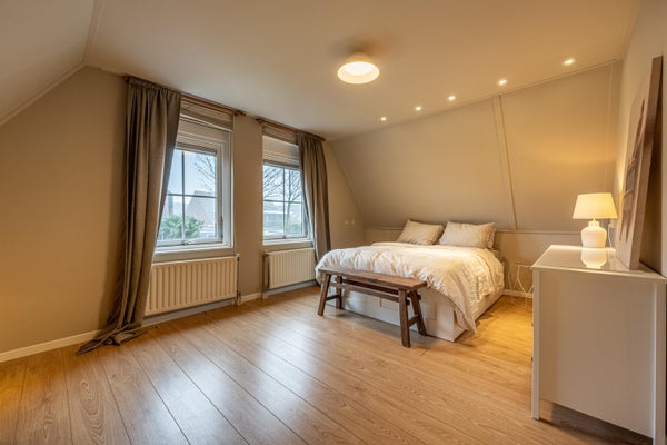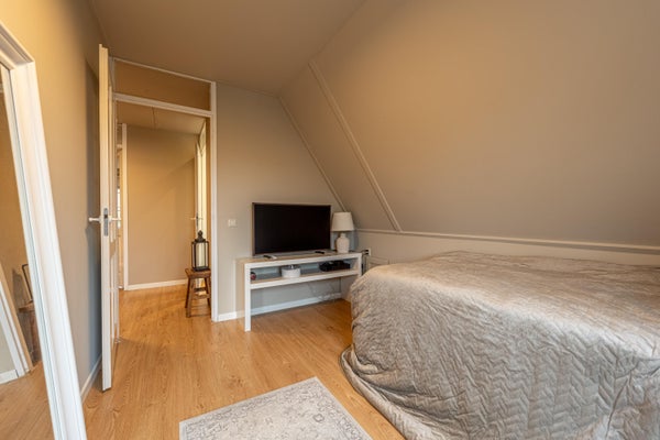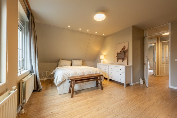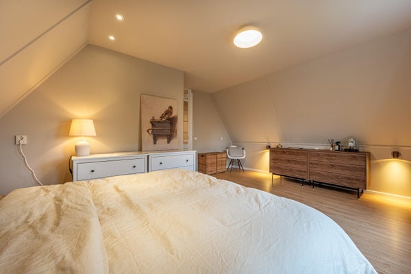 De slaapkamer aan de achterzijde is ruim en geschikt als master bedroom. Door de indeling is hier eenvoudig een inloopkast te realiseren. De inbouwspots zijn hiervoor al aanwezig.
