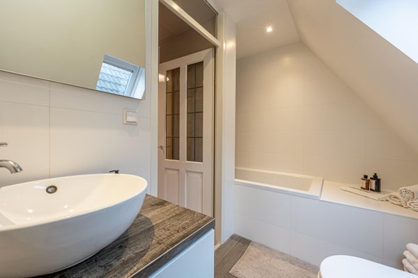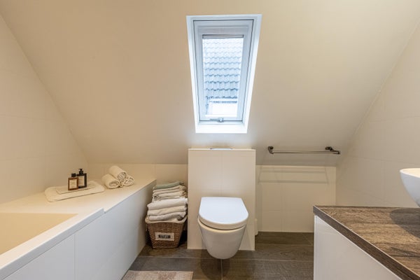 De badkamer is uitgevoerd in dezelfde stijl als het toilet op de begane grond en beschikt over een ligbad, wastafelmeubel en een hangend toilet.