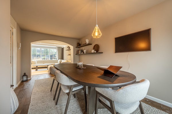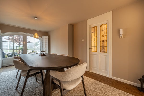 Aan de voorzijde bevindt zich de eetkamer, een lichte ruimte met dubbele openslaande deuren in een afgeronde vorm. De shutters zorgen hier voor privacy en sluiten mooi aan bij de landelijke stijl van de woning.