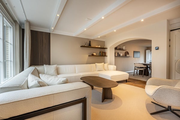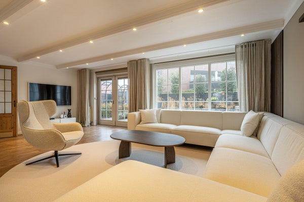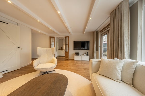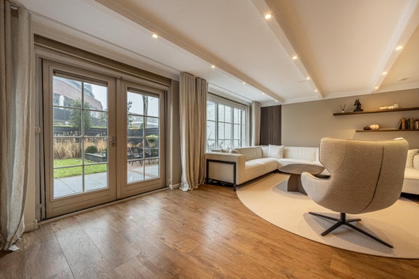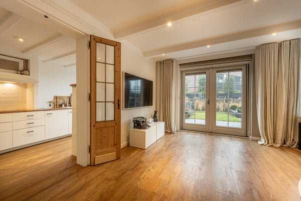 De woonkamer is ruim en licht, met grote raampartijen en openslaande deuren naar buiten. Het balkenplafond, de roedeverdeling in de ramen en de strakke wandafwerking zorgen samen voor een warme, landelijke uitstraling. De openslaande deuren zijn voorzien van horren en een elektrisch zonnescherm.
