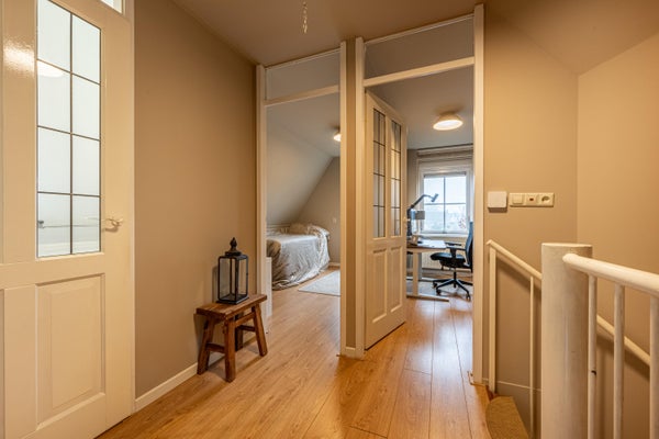 Op de eerste verdieping bevinden zich drie slaapkamers en de badkamer. Met uitzondering van de badkamer is de verdieping afgewerkt met een laminaatvloer in een warme houtlook.
