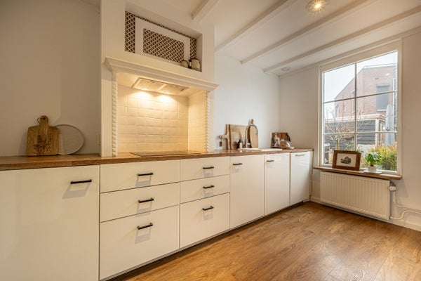 De keuken is gerealiseerd in een uitbouw aan de zijkant van de woning en loopt door tot aan de achterzijde. Deze uitbreiding zorgt voor extra leefruimte en een fijne verbinding met de tuin.