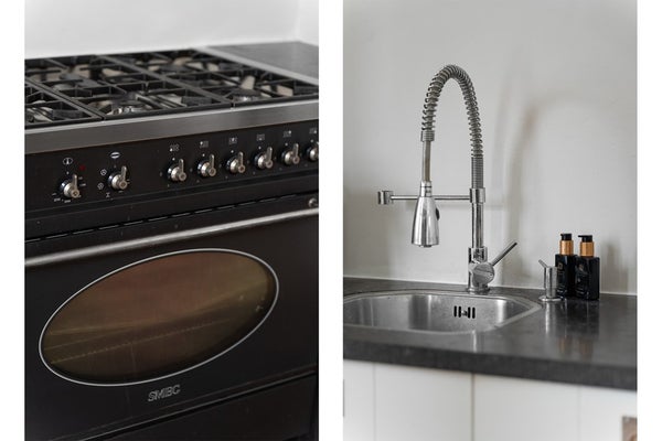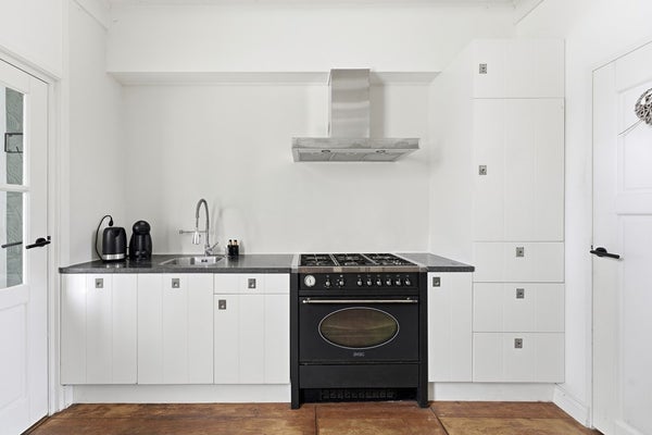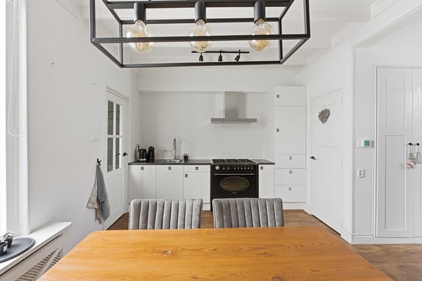 Keuken: De landelijke open keuken is voorzien van een gasfornuis met zes pitten, een oven, afzuigkap en een vaatwasser. Vanuit de keuken is er toegang tot het portaal/de bijkeuken. Daarnaast is er een ruime kelder-/trapkast aanwezig voor extra opslag, waar tevens de wasmachine is opgesteld. De keuken is afgewerkt met een houten vloer en een authentiek balkenplafond.