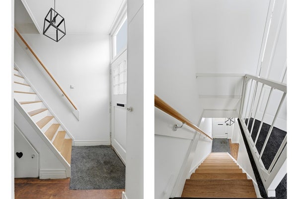 Entree: De hal biedt ruimte voor jassen en geeft toegang tot de trap naar de eerste verdieping. Onder de trap is een kastje gerealiseerd voor het opbergen van schoenen. De ruimte is afgewerkt met gestuukte wanden, een houten vloer en een gipsplafond.