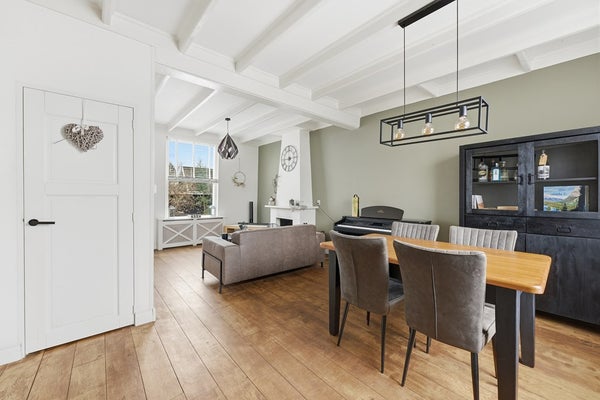 Woonkamer: Bij binnenkomst in de woonkamer nodigt de open haard direct uit om te blijven zitten. Ondanks het compacte formaat oogt de ruimte dankzij de lichte afwerking verrassend ruim. Er is volop bergruimte aanwezig, met zowel een handige vaste kast voor glaswerk en servies als een ruime kelder-/trapkast. Het karakteristieke balkenplafond en de houten vloer zorgen voor een warme en sfeervolle uitstraling. De woonkamer is afgewerkt met gestuukte wanden.