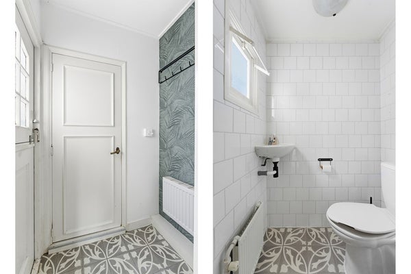 Toilet: Het toilet bevindt zich aan de achterzijde van de woning, in een aanbouw. Het toilet is voorzien van een staand closet, fonteintje, radiator en een raam. De ruimte is volledig betegeld.