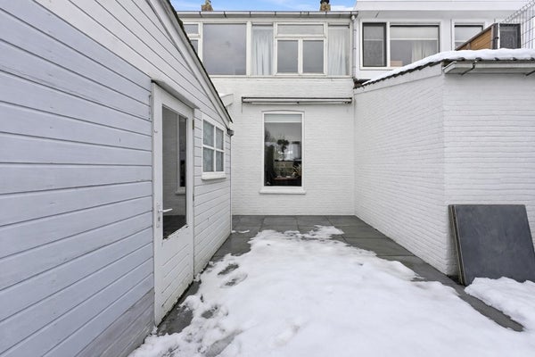 Bijkeuken: De bijkeuken fungeert als voorportaal naar het toilet en de achtertuin en biedt ruimte voor een garderobe. De ruimte is afgewerkt met tegels en gestuukte wanden.