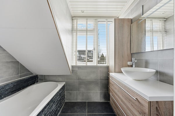 Badkamer: De nette badkamer is voorzien van ligbad en een mooi wastafelmeubel met geïntegreerde wastafel. De ruimte is volledig betegeld en voorzien van inbouwspots.