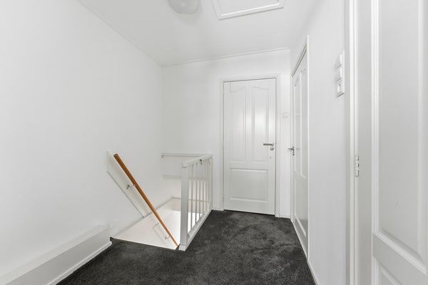 Overloop: De overloop biedt toegang tot drie slaapkamers, de badkamer en de vliering via een vlizotrap. De ruimte is afgewerkt met vloerbedekking, gestuukte wanden en een gipsplafond.