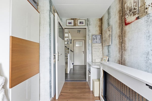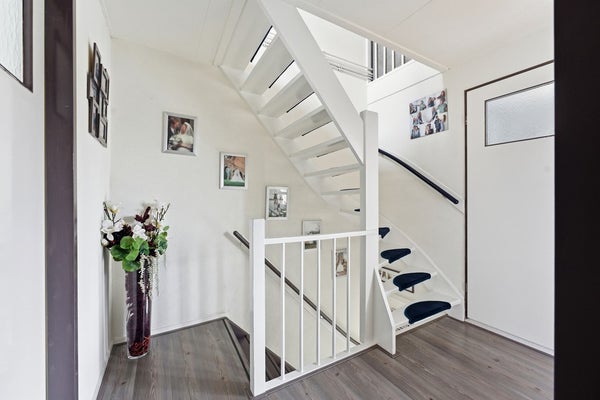 Overloop: De overloop biedt toegang tot drie slaapkamers, de badkamer en de trap naar de tweede verdieping. De ruimte is afgewerkt met een laminaatvloer, spachtelputz wanden en een gipsplafond.