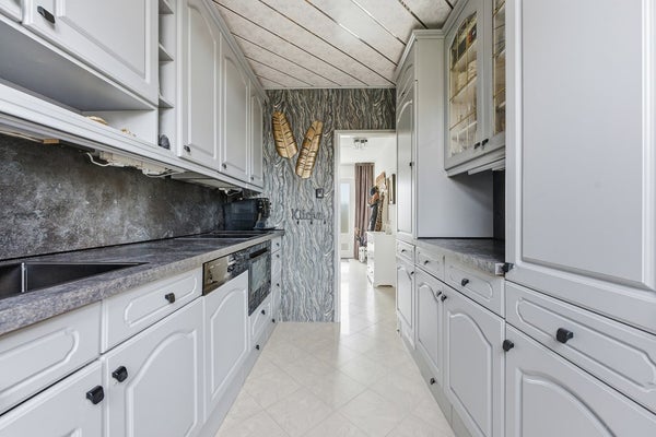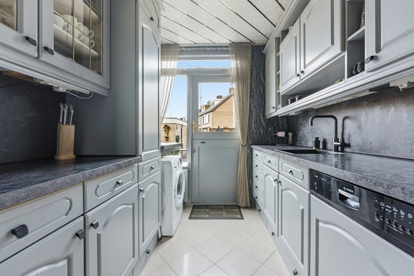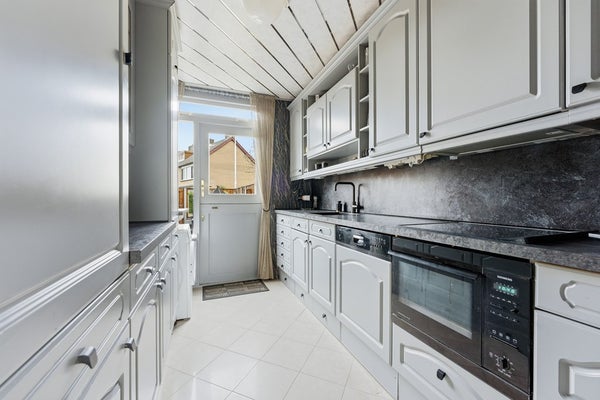 Keuken: De gesloten keuken bevindt zich aan de achterzijde van de woning en heeft directe toegang tot de tuin. De keuken is opgesteld in twee rechte blokken en voorzien van diverse inbouwapparatuur. Ook bevindt zich hier de aansluiting voor de wasmachine. De ruimte is afgewerkt met plavuizen op de vloer, behangwanden en een plafond met delen.