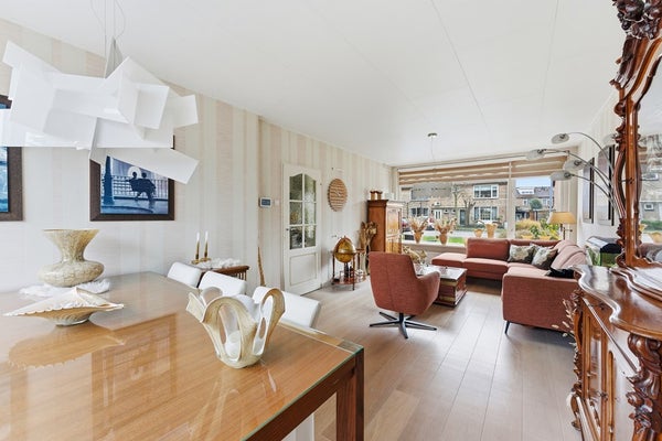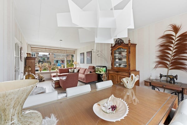 Woonkamer: De doorzonwoonkamer strekt zich uit over de volledige lengte van de woning en ontvangt licht vanaf de voor- en achterzijde. Aan de voorzijde is zonwering aanwezig. De woonkamer is afgewerkt met een nette parketvloer, behangwanden en een plafond met delen.