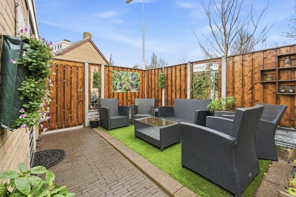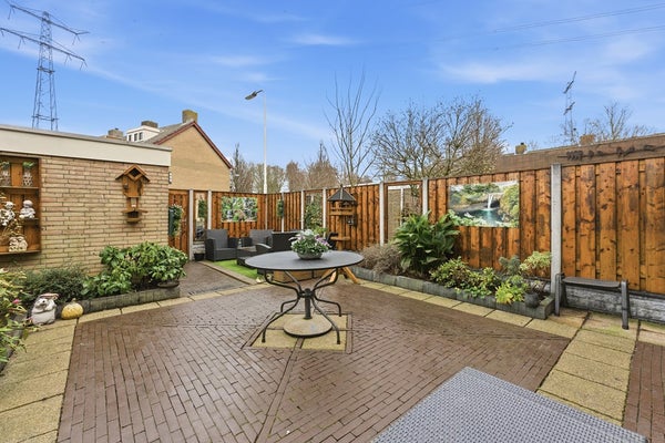 Achtertuin: De achtertuin is gelegen op het noorden en beschikt over sierbestrating en tuinborders. Een wateraansluiting maakt tuinonderhoud gemakkelijk en de tuin is achterom te bereiken. De tuin is afgewerkt met bestrating en borders.