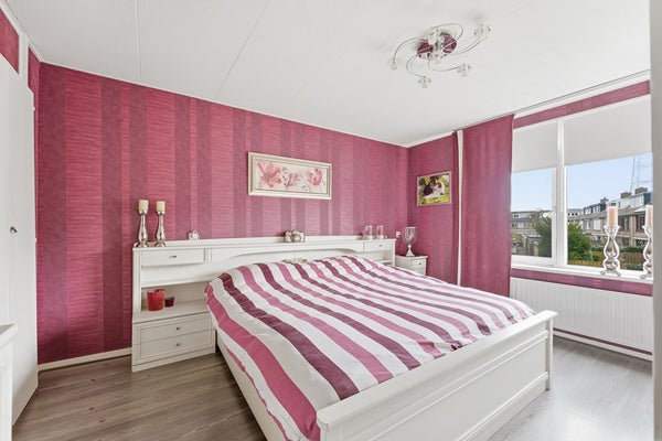 Slaapkamer 1: Deze slaapkamer is gelegen aan de voorzijde en beschikt over een deur naar het balkon. Grote ramen zorgen voor lichtinval en er is een inbouwkast aanwezig. De kamer is afgewerkt met laminaat, behangwanden en een gipsplafond.