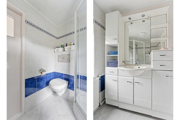 Badkamer: De badkamer is volledig betegeld en ingericht met een wastafel, toilet en een douche. Er is een raam aanwezig voor ventilatie en daglicht. De ruimte is afgewerkt met tegelwerk.