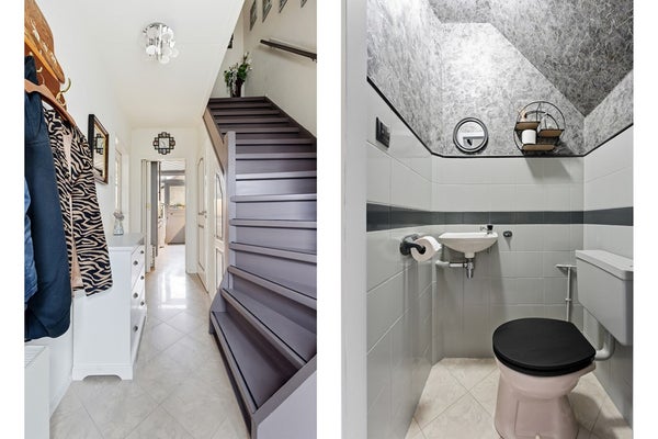 Toilet: Het toilet is gesitueerd in de hal en beschikt over een staand toilet en een fonteintje. De ruimte is deels betegeld.