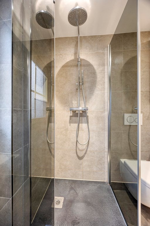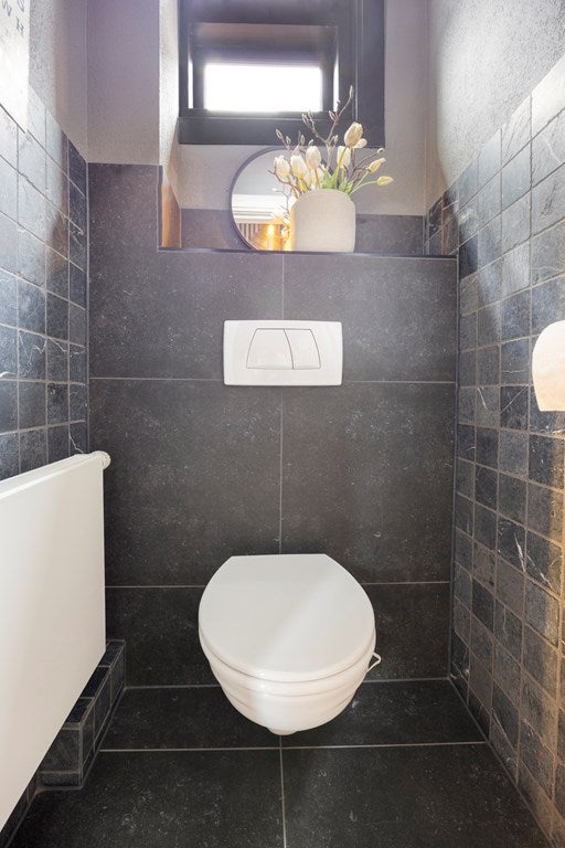 De badkamer is praktisch en compleet ingericht met een ruime inloopdouche, een wastafelmeubel en een tweede toilet.