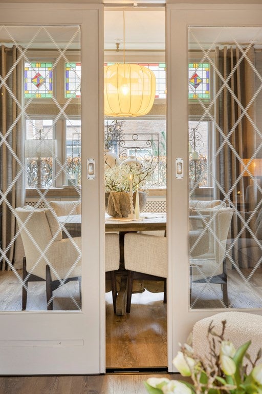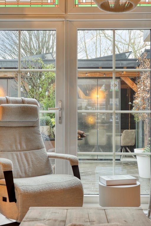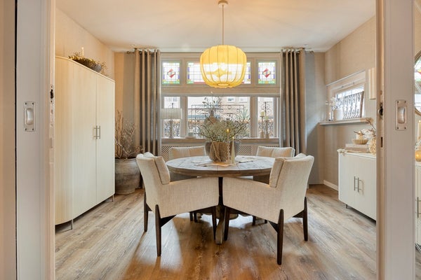 De royale en lichte woonkamer is door middel van stijlvolle ensuite deuren en vaste kasten opgedeeld in een voor- en achterkamer. De voorkamer beschikt over een sfeervolle raampartij, terwijl de achterkamer is voorzien van openslaande deuren naar de tuin en een gezellige houtkachel. Ook hier zorgen de glas-in-loodramen voor een warme en karakteristieke uitstraling. De gehele woonkamer is afgewerkt met een mooie laminaatvloer.
