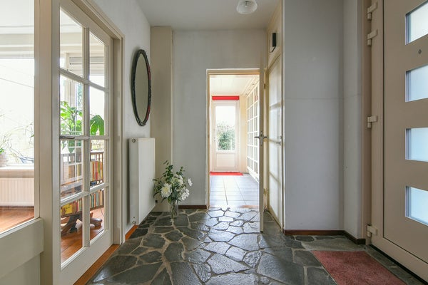 De entreehal is afgewerkt met een leisteenvloer, terwijl in de woonkamer eiken vloerdelen zijn gelegd – een combinatie die zorgt voor een warme, tijdloze uitstraling.